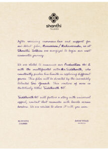 தயாரிப்பாளர் அருண் விஸ்வா கூறும்போது, “சாந்தி டாக்கீஸ் நிறுவனத்திற்கு என் அம்மாவின் பெயர்தான் சூட்டியிருக்கிறோம். கதைகள் தேர்ந்தெடுக்கும்போது, என் அம்மா தியேட்டரில் அமர்ந்து படம் பார்த்தால் எந்த மாதிரியான கதைகளை பார்த்து மகிழ்வாரோ அப்படியான நல்ல கதைகளையே தேர்ந்தெடுக்க வேண்டும் என்று விரும்புகிறேன். குடும்ப பார்வையாளர்களை ஈர்க்கும் வணிக படங்களை உருவாக்குவதே சாந்தி டாக்கீஸின் முழுமையான நோக்கம். ஸ்ரீகணேஷ் படத்தின் கதையை சொன்னபோது இது மொழி, வயது போன்ற தடைகளை தாண்டி அனைத்து தரப்பு பார்வையாளர்களையும் ஈர்க்கும் என்பது உறுதியாகத் தெரிந்தது. சித்தார்த் சாரின் நடிப்பு ஆர்வம் நம் கற்பனைகளுக்கும் அப்பாற்பட்டது. படத்தில் இருந்து அடுத்தடுத்து ஆச்சரியமான பல அறிவிப்புகளை வெளியிடுவோம்” என்றார்.